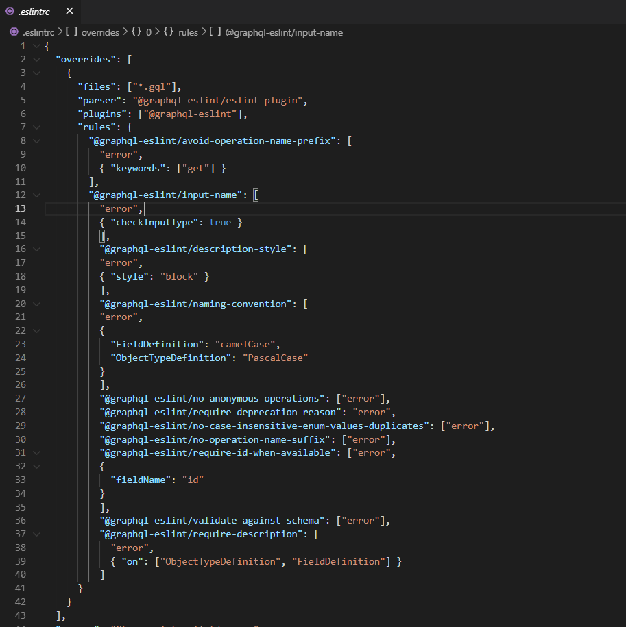 A sample .eslintrc file to be used for GraphQL ESLint would look something like this: