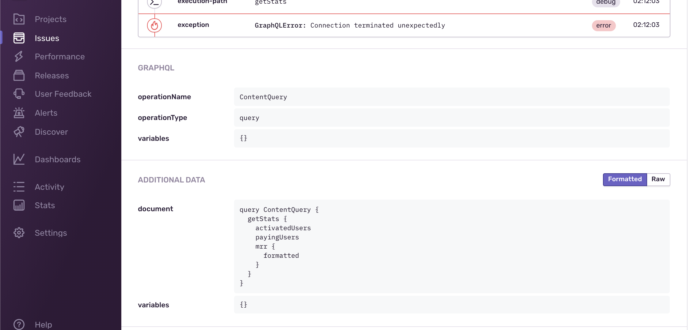 The operation name, document, variables are collected on errors, and the breadcrumbs that led to the error. You can also add any custom values that you need.
